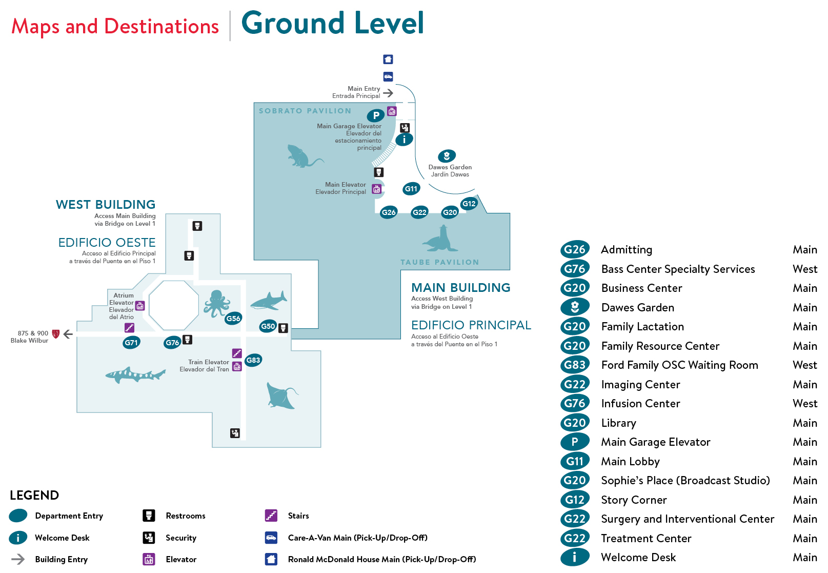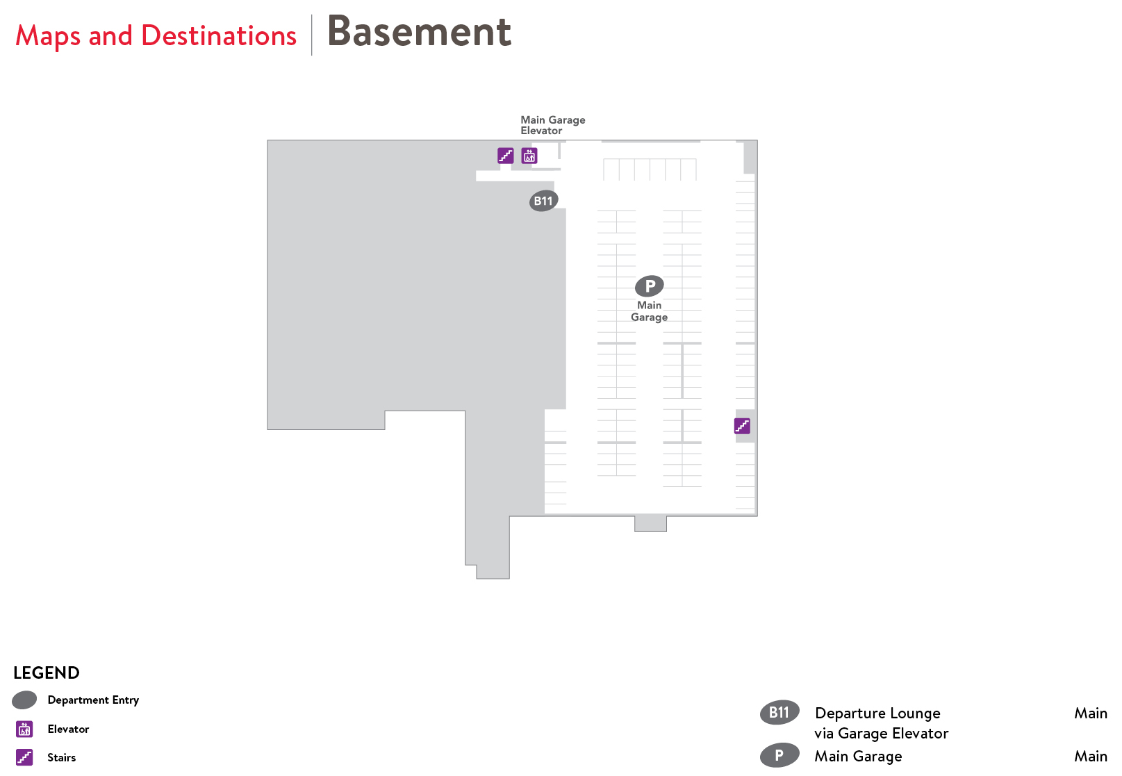 The Main building garage is for our families and visitors and has dedicated spaces with electric vehicle charging stations. Visitors can drop off their car at the valet podium at the main entrance and pick up their car at the Departure Lounge. The Departure Lounge is open Monday through Friday from 8 a.m. to 4:30 p.m., and it is also a designated pickup spot for Care-A-Van and Ronald McDonald House shuttle.