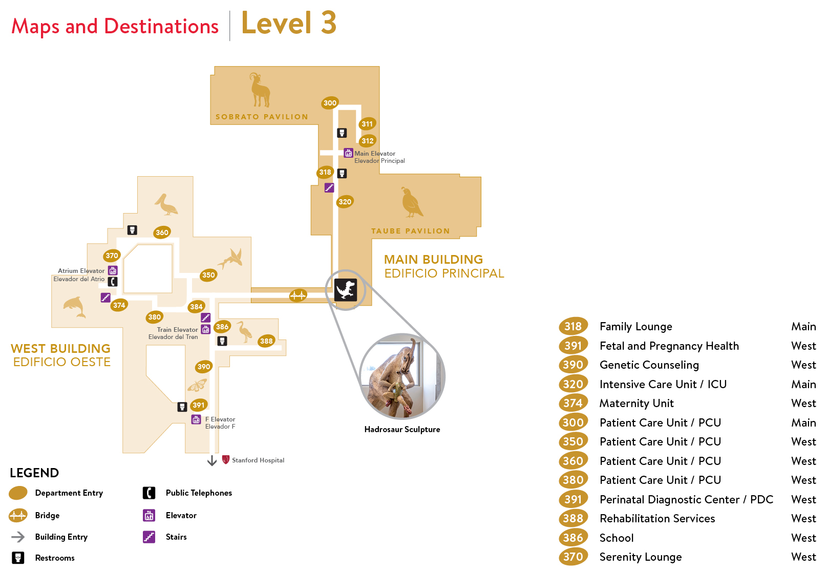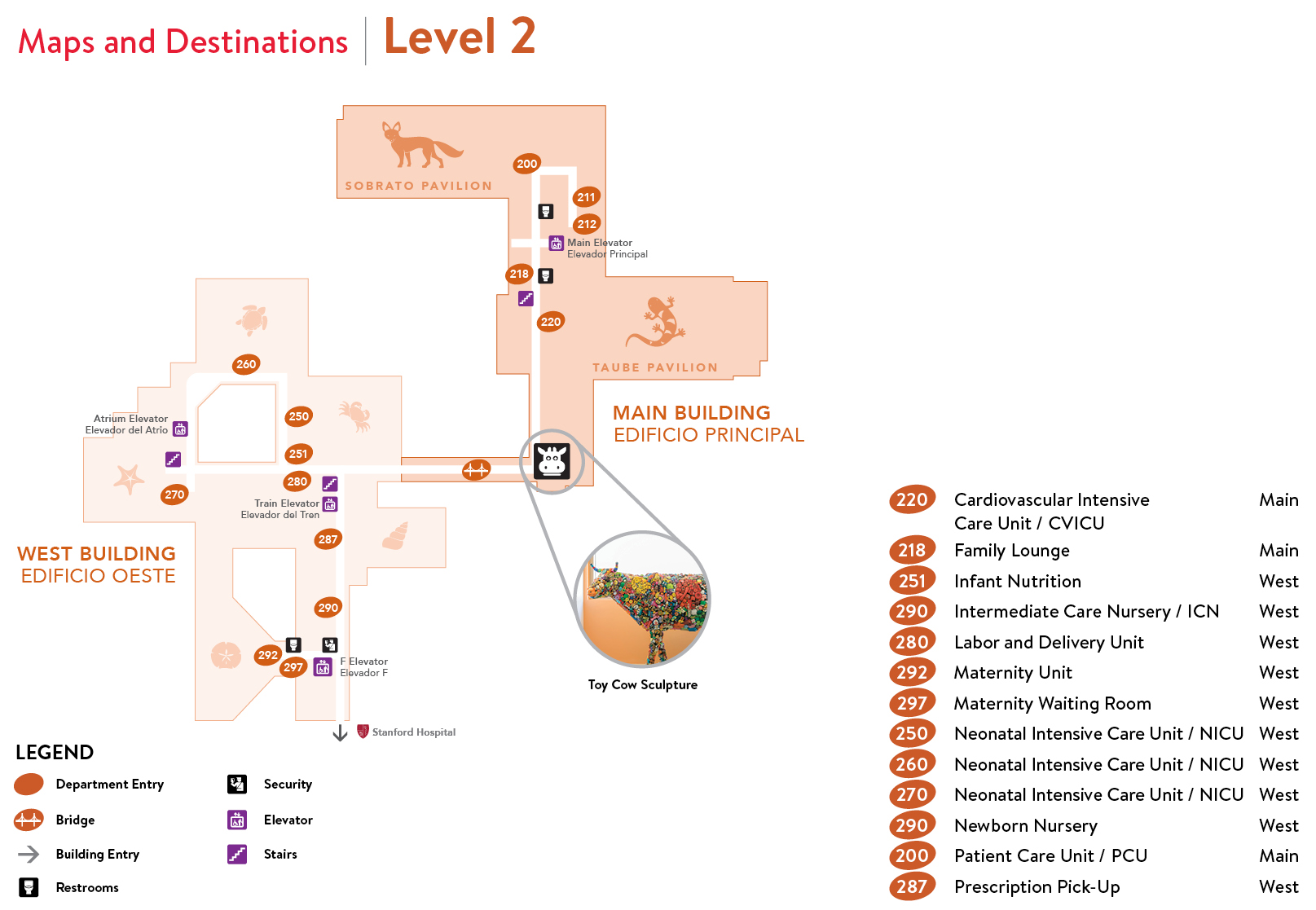 Evoking the imagery of the Northern California ecosystem, each floor at Lucile Packard Children's Hospital Stanford has a different theme and animal ambassadors that give you the feeling that you're part of nature as you move through the hospital. A coordinated array of animals and colors helps identify the hospital's department names and room numbers.