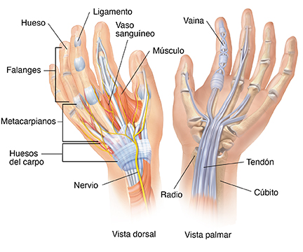 En el interior de la mano, se puede encontrar una gran cantidad de músculos, ligamentos, tendones y vainas. Los músculos son estructuras que pueden contraerse, lo que permite el movimiento de los huesos de la mano. Los ligamentos son tejidos fibrosos que ayudan a mantener unidas las articulaciones de la mano. Las vainas son estructuras tubulares que rodean parte de los dedos. Los tendones conectan los músculos del brazo o de la mano con el hueso, lo cual permite el movimiento, y por lo general pasan por el interior de las vainas.